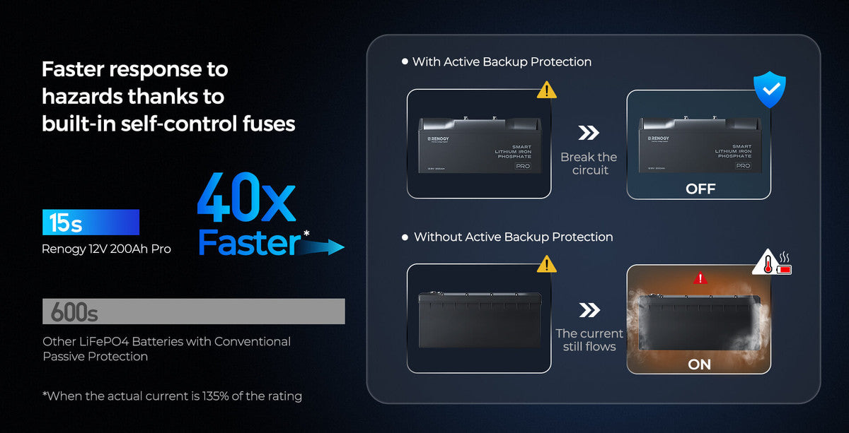 Living off the grid in a warmer climate is safer than ever with the all-new Pro lithium battery, thanks to its fire-resistant casing (UL94 V-0). It offers outstanding fire resistance to vertical burning, a crucial safety feature to safeguard your power supply against fire hazards, reducing the risk of fire spreading, especially when living in remote areas where emergency response can be delayed.