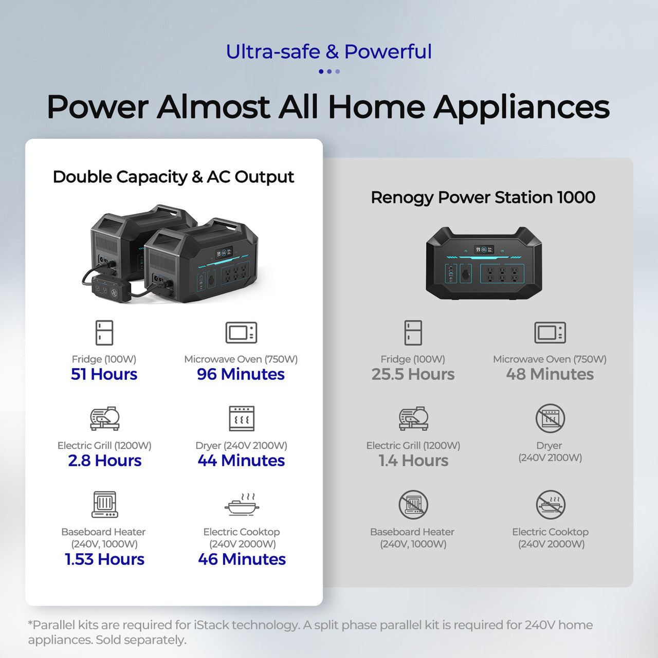 - This portable generator of large capacity 998wh support parallel connection for doubled AC output 2700W, reaching up to 1997Wh capacity(Parallel kit optional). This lifepo4 power station is the optimal choice for outdoor off-grid living and camping to power refrigerator, CPAP, TV, electric grill, fan, mini-cooler, and more for your outdoor and home use.