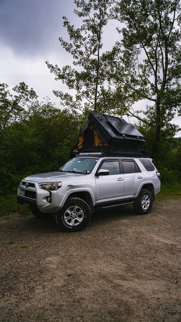 At the beginning of the trip, I had two 100w Renogy panels mounted on top of my hard shell roof top tent. A few weeks ago I switched over to a 200w ShadowFlux panel for better performance in shady camping situations.
