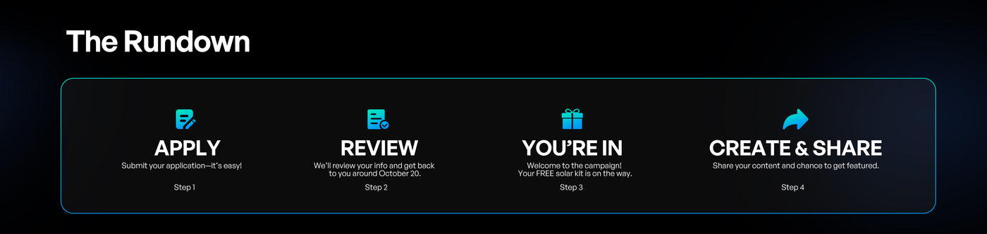 Winners will install the solar kit and share their journey through photos, videos, and stories. Their experience will help inspire others to begin their own adventure.