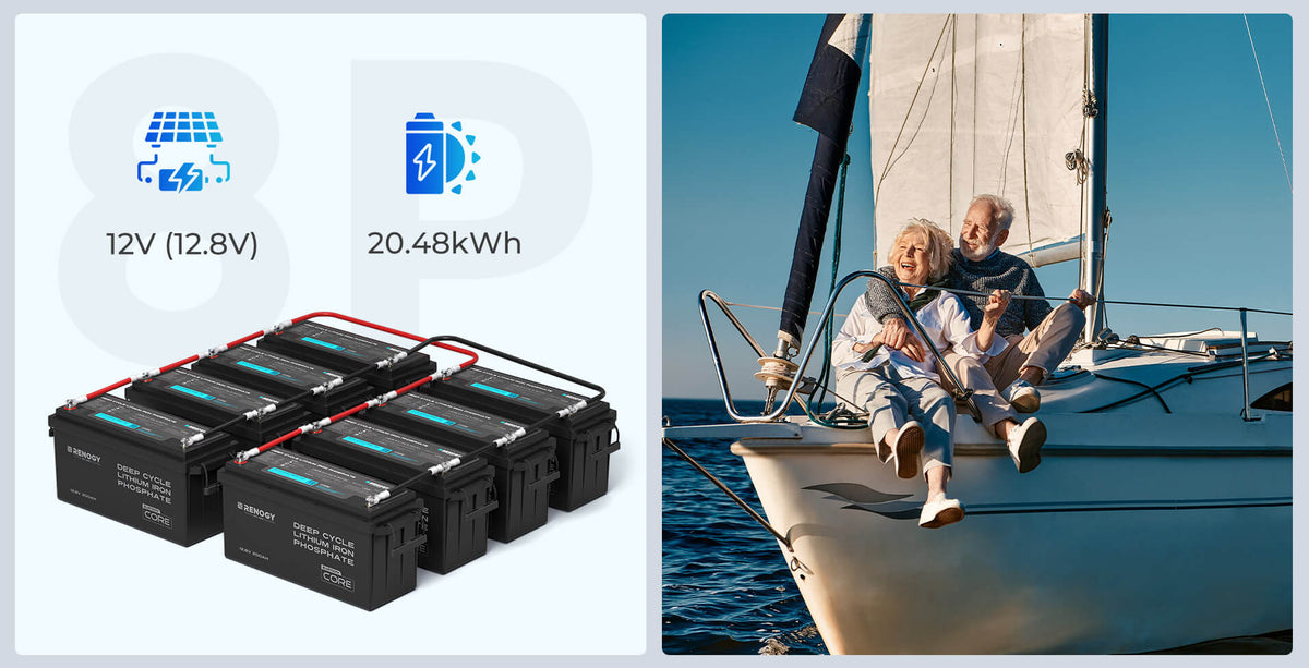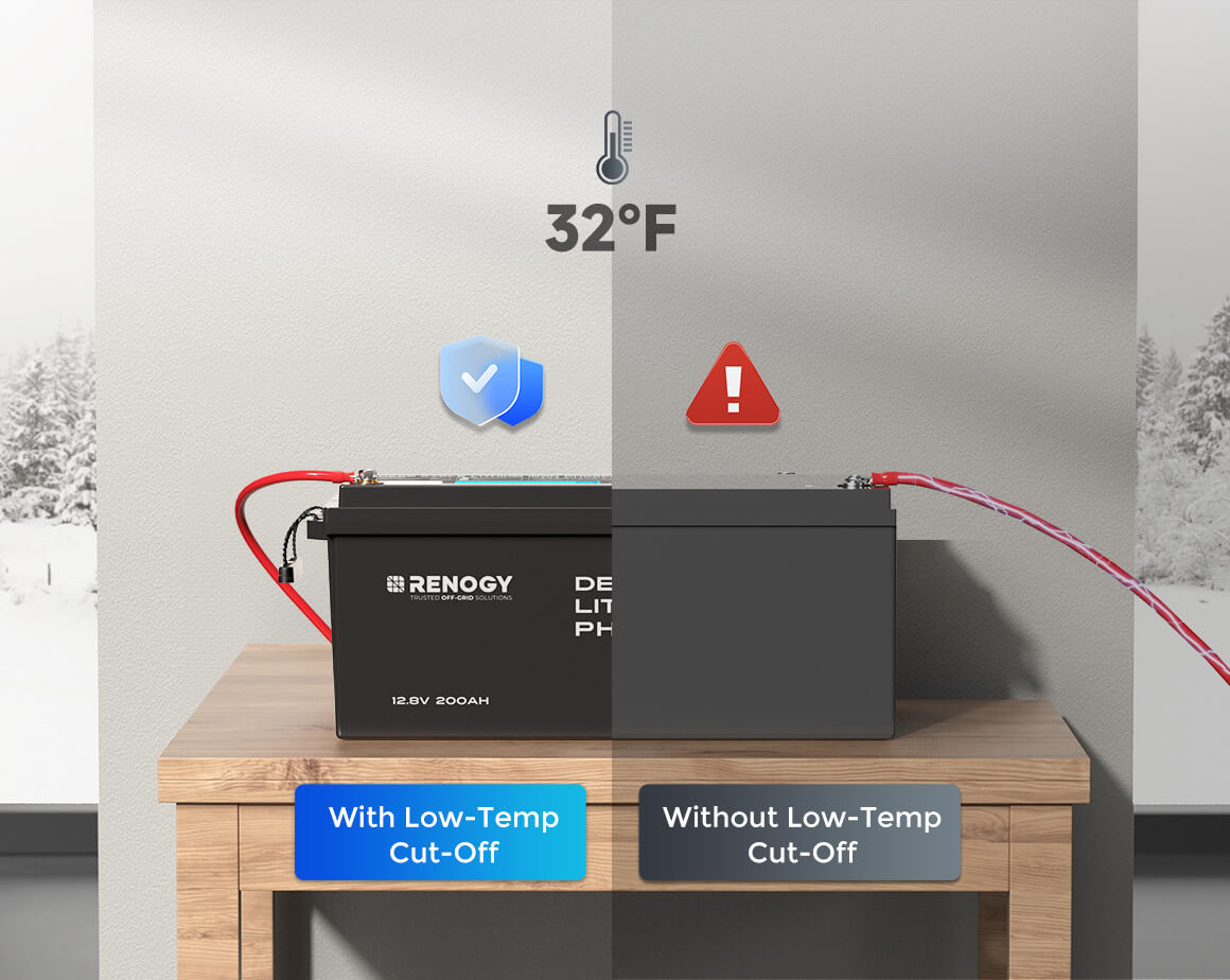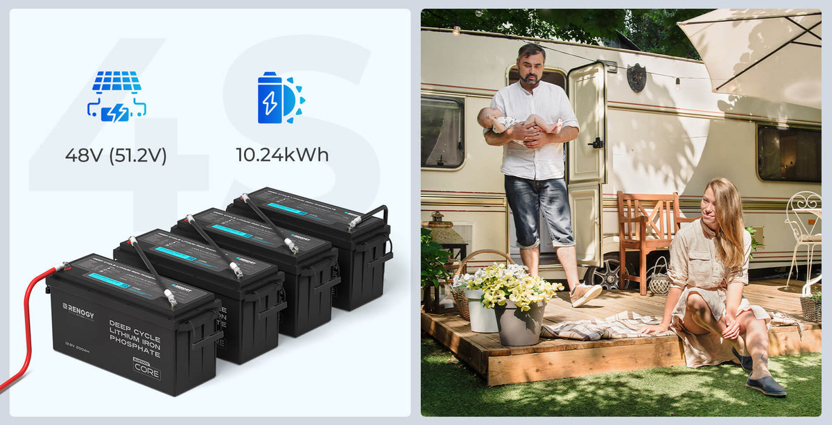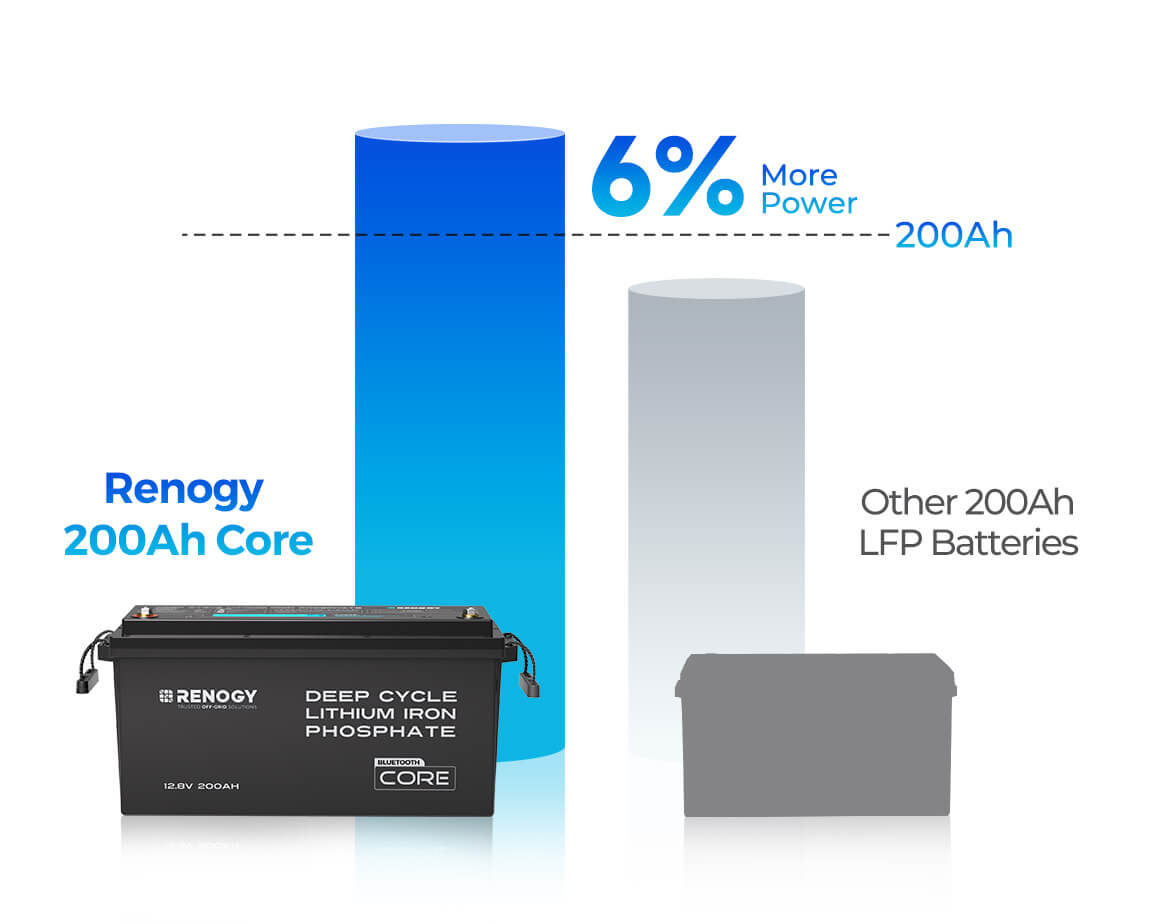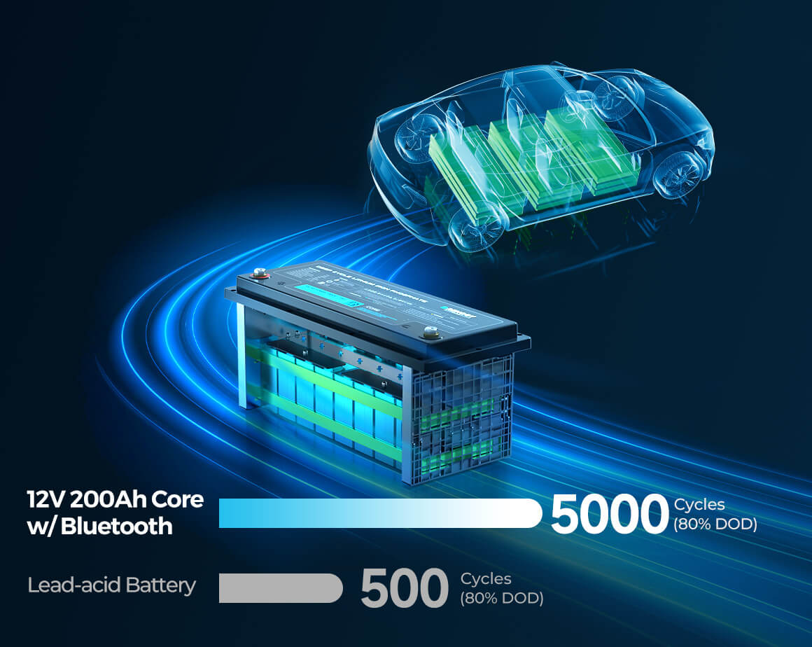 Renogy 12V 200Ah Core Series Batteries are capable of delivering 5000 cycles with a recommended 80% depth of discharge (DOD). Meanwhile, these batteries combine a true 200A battery management system (BMS), IP65 protection, and rugged structure design to brace for challenges wherever you go.
