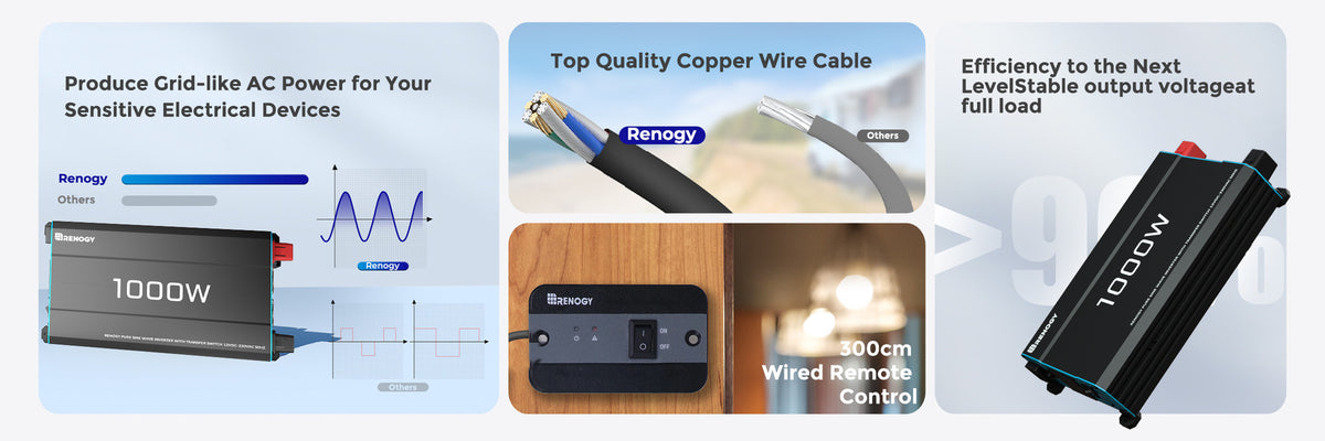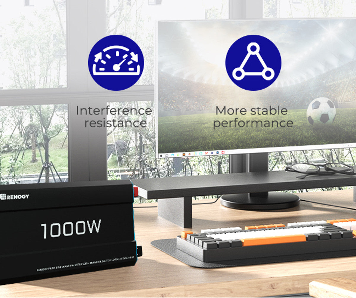- 【High-Quality Power Output】 Renogy's 1000W 12V Pure Sine Wave Inverter uses advanced sine wave technology, delivering cleaner, smoother power. Ideal for sensitive electronics, it extends the device's lifespan and prevents interference.