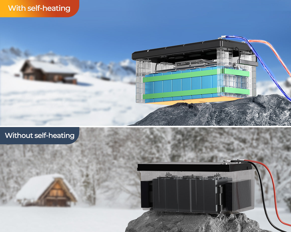 With the industry's highest 200W heating element, this 24V 100Ah LiFePO4 Battery can heat up twice as fast as other heated batteries on the market. Please ensure a stable charge current greater than 10A for each battery to initiate the self-heating.