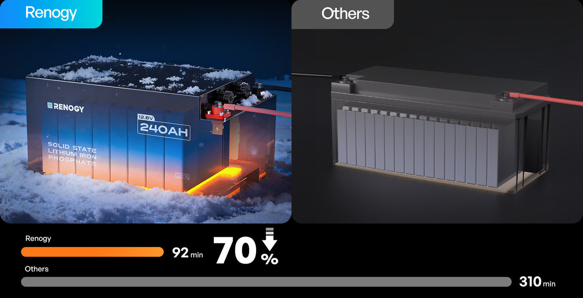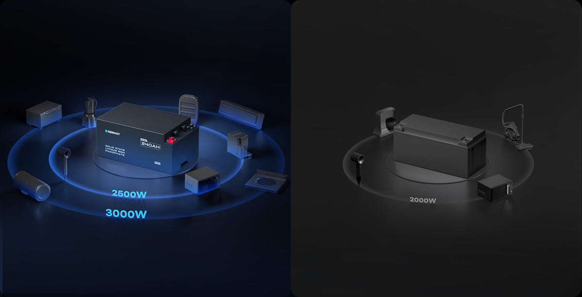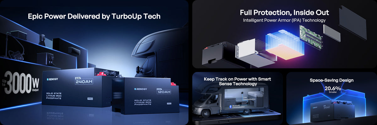 Renogy Pro S1 series LiFePO4 batteries can steadily deliver over 3000W output* to run 99% of appliances in your motorhomes, such as air conditioners, coffee machines and hair dryers. With strong peak output, they enable simultaneous operation of microwaves, blenders and high-power appliances. So you don't have to compromise comfort all year round. *Based on the Pro S1 240 model.