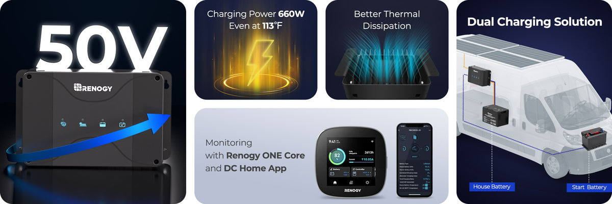 Dual-Source Charging: Combines a 50A DC-DC charger (from vehicle alternator) and an MPPT solar controller in one unit. Rapid, Efficient Power: Quickly charges batteries from both your vehicle and solar panels with maximum solar efficiency.
