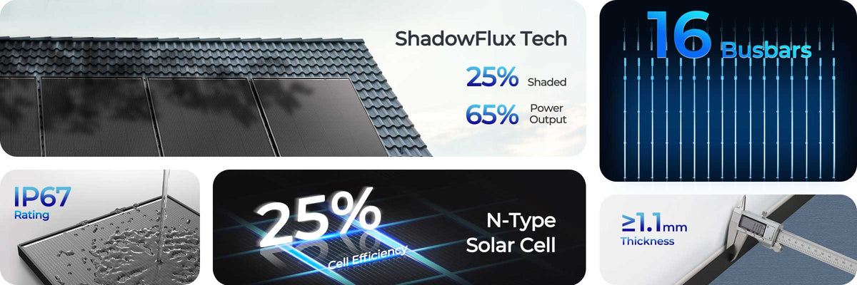 The solar panels feature anti-shading technology for consistent performance. 25% efficiency with anti-hotpsot tech for less overheating. 7% smaller, 10% lighter than other panels for easy install.
