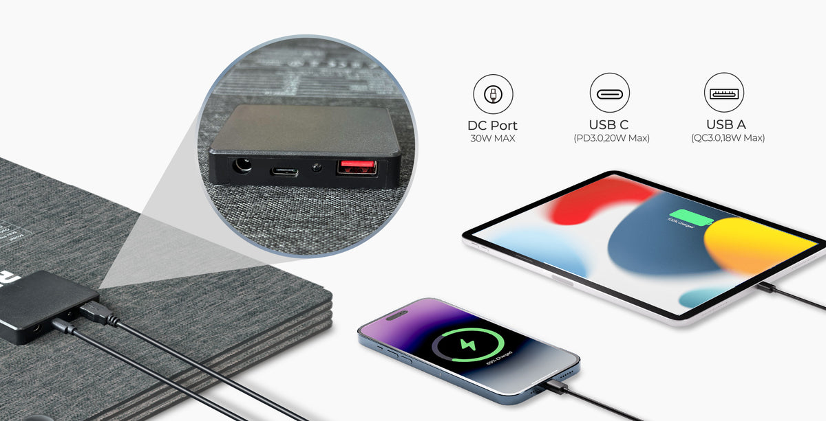 - 【Multiple Fast Charging Ports】Renogy Portable Solar Charging Pad with 1*USB C(PD3.0,20W Max) ,1*USB A(QC3.0,18W Max) and 1*DC Output (30W). The product comes with a USB A to USB C adapter cable, which can easily charge your cell phone, tablet and other electronic devices to meet your outdoor charging needs.