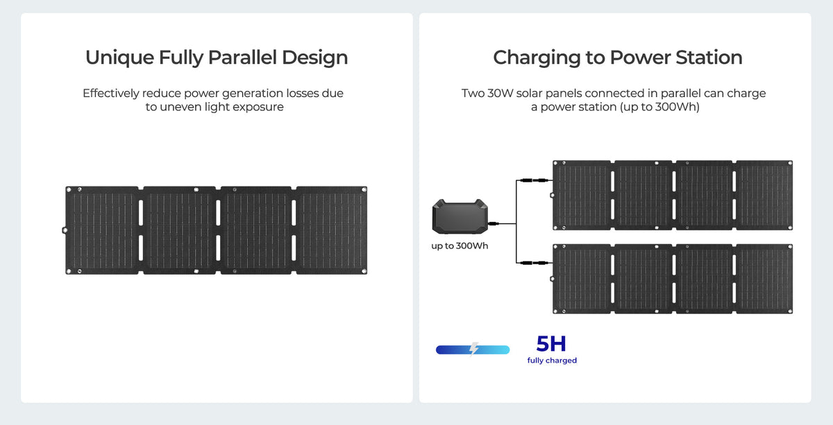 - 【UNIQUE FULL PARALLEL DESIGN】: The 30W portable pack is designed with full parallel connection, which is able to reduce the problem of plummeting power generation caused by uneven light exposure of the four panels. Even if one of the panels is blocked, there is at least 75% power output.