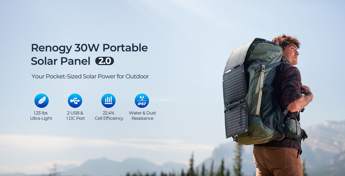 - 【Easy to Use, Suitable for Outdoor】Renogy portable solar charging panel comes with 6 metal hanging holes as well as 4 carabiners, which can be easily hung on your backpack or tree to get solar energy for you during fishing, hiking, RV camping and other off-grid activities.