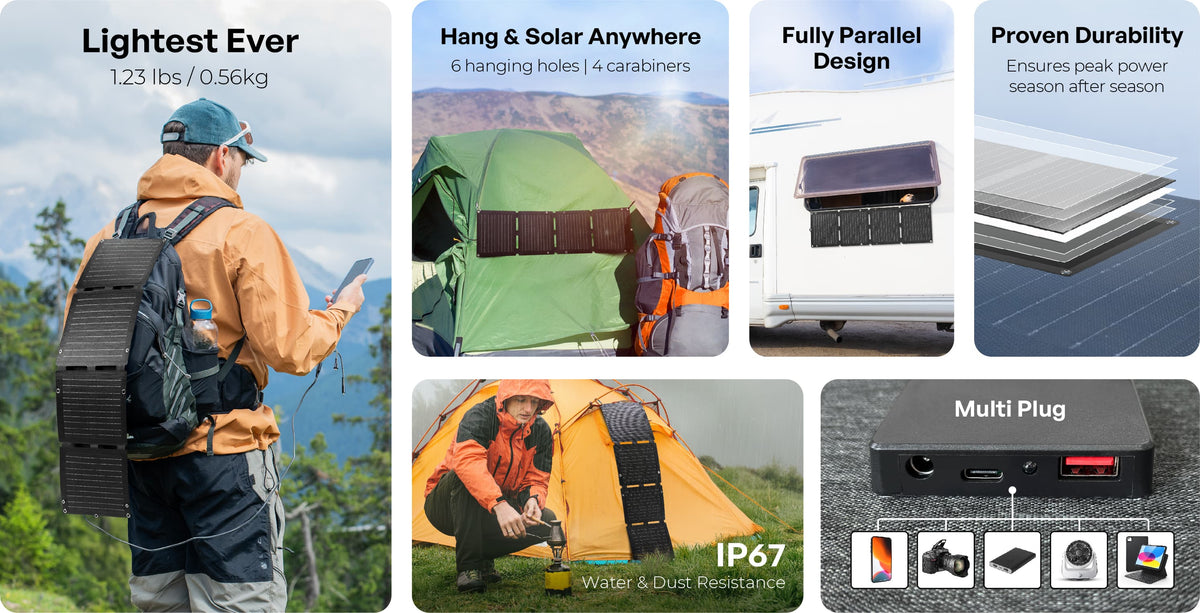 This panel is 18% lighter and 11% smaller for portable outdoor use